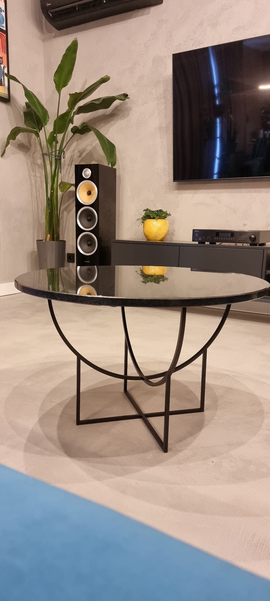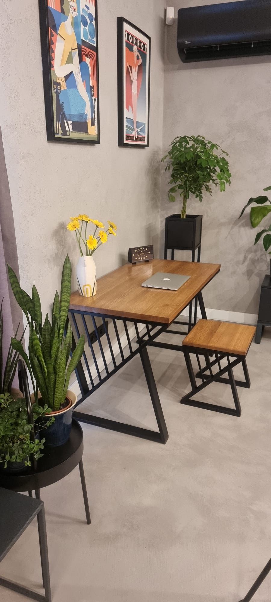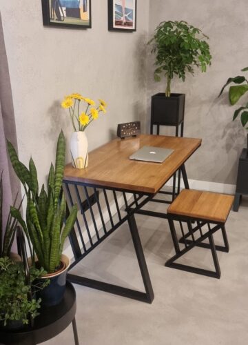 - Stoły z blatem z litego drewna i metalowymi nogami,